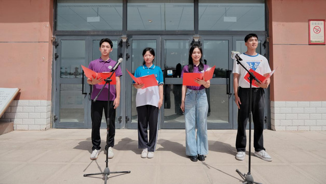在第三师图木舒克市第二中学的“推普铸魂·语通家国”主题升旗仪式上,实践团成员与二中学生携手主持、共同朗诵红色稿件《旗帜》——不同地域的青春身影因同一种语言汇聚,红色基因在齐声诵读中浸润心灵,沪疆学子的情谊在互动中悄然升温。